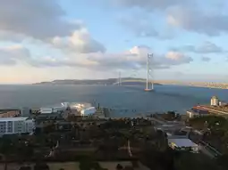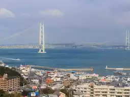 The bridge connects Osaka Bay and the Akashi Strait of the Seto Inland Sea. The strait is about 4 kilometers wide and has a maximum water depth of about 110 meters. The tides flowing through the strait are as high as 4.5 meters per second.