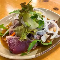 The thickness of the tataki is exquisitely thicker with sauce than with salt, which is a great skill.