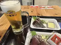 At Kochi Station, make sure to visit the famous "Hirome Market!" You can start drinking as early as 10 AM—perfect for those who want to enjoy a drink right after checking out of their hotel. 🍶 For sake lovers, this is paradise. Order a shochu on the rocks, and you'll get a glass filled to the brim. You can also watch live demonstrations of bonito being seared over straw flames. ✨