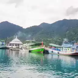 This trip was the longest driving trip of my life. We were exhausted, and we had to make numerous stops. We left Bangkok around 8 AM and arrived at Ao Thammachat Pier around 1:30 PM. From there, we bought tickets to board the ferry. The ride took 30 minutes, but since there were a lot of cars on the day we went, we had to wait a bit longer. There were drink and snack shops on the ferry, so we didn't need to pack a lot of snacks.