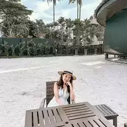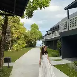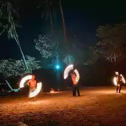 Once we reached the shore, we drove up to the island. The first part of the way up was a bit scary. We started with lunch at The U Turn Bar & Restaurant, a seafood restaurant serving made-to-order dishes at reasonable prices. Once we were full, we were ready to continue our journey. It was only a short drive to the entrance of Khlong Phlu Waterfall. We arrived around 4 PM, so we didn't go in, but we did snap a few photos of the stream at the entrance to relish the moment. We then went to feed the baby elephants at the entrance. A tray of bananas costs 50 baht. They're adorable, but the first one tends to steal some from the others. After that, we headed straight to our accommodation. I'm so excited about this place! It's so big and brand new, with ample parking and a spacious lobby. A staff member helped me push my luggage to my room. After checking in and putting away my things, I quickly changed into my clothes and went for a swim. They even have a water park! It's amazing! #MyFirstKohChang We had our fill of seafood and a delicious welcome drink afterward. The first night was a seafood set with a rich and creamy seafood tom yum soup. Luckily, there was a fire show on the day we went, which was amazing. I'd seen the first one in Krabi and thought it was exciting, but this one was even better! There were so many people playing and so many tricks. I highly recommend staying until the end. The highlight comes at the end.
