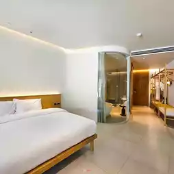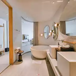 The rooms in the new zone of the hotel, the "Reserve Collection," are modern-style accommodations by the sea. There are three styles to choose from: seafront rooms and sea view rooms. The Reserve Ocean room is where you will stay, which is located by the sea and has a See Through sea view. The room is spacious and comfortable, with a wide balcony for admiring the sea view. There is also a modern circular bathtub in the room, and the bathroom has a curved glass partition.