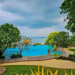 The hotel has two large swimming pools: the Beachfront Swimming Pool, which is near the beach, and the Cliff Top Swimming Pool, which is a two-story pool with a slide.