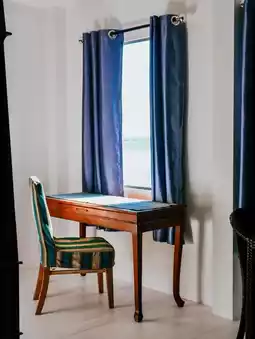 The room is very spacious with a sofa and a work desk corner.