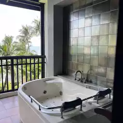 Going to the balcony, there was a large bathtub for two people with a water spray system. I brought a bath bomb with me, played with soft bubbles, and enjoyed the view. It was so relaxing.