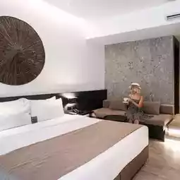 I want to say that I really like the atmosphere here. Starting with the bedroom, it's beautiful, clean, and modern. I got a full rest, and there's also a water park to play in.