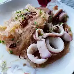 🧡 #Stir-fried glass noodles with squid and shrimp paste from Koh Chang Stir-fried until juicy, not dry. The shrimp paste flavor is not prominent, it is clearly salty. The shrimp paste is mild, fragrant but not salty. It is not too strong when eaten alone. The squid is fresh and crispy.