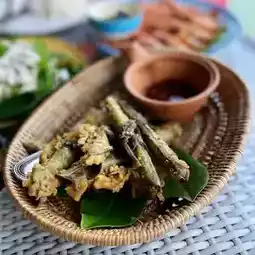 🧡 #Fried Mangrove Leaves Stuffed with Pork and Shrimp The mangrove leaves are quite thick, but they are fried until crispy and not oily at all. Stuffed with shrimp and pork that are seasoned just right. Dip it in the sweet and slightly sour sauce. This dish is very enjoyable.