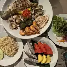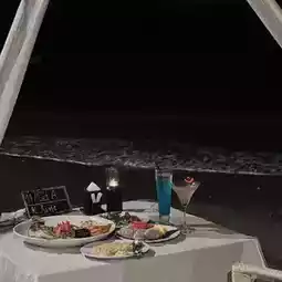 In the evening, have a meal by the sea, a seafood set, rice + vegetables, you can take as much as you want.