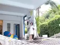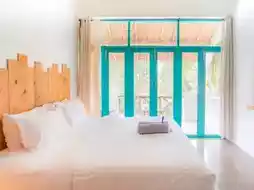🏨Pajamas Koh Chang 🛖A super cool hostel in Balinese style, decorated in white tones contrasting with various colors according to the room type. There is a swimming pool in the middle with a chill atmosphere. It is located not far from Klong Prao Beach, Koh Chang, and you can walk to the sea. 🏖