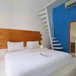 The interior of the accommodation is designed in a Santorini style, giving a feeling like being abroad. There are many types of rooms to choose from, including a dormitory, which is like a hostel, and a deluxe room that can accommodate 2 and 4 people, truly meeting all your relaxation needs. The room also has complete amenities.