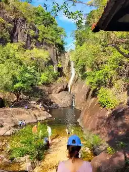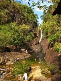 When you reach the waterfall, the sight in front of you is a tall waterfall flowing down through the rocks into the pool below. The color of the water is clean and beautiful. You can play in the water or sit on the edge of the rocks and dip your feet in the water, which is just as cool and refreshing. The atmosphere is quiet, surrounded by the sound of the waterfall and nature, perfect for those who want to escape the hustle and bustle.