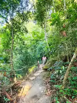 The nature trail to the waterfall is about 500 meters long, walking into a shady forest full of tall trees, green ferns, and the sound of birds chirping mixed with the sound of gently flowing water, helping you feel relaxed and refreshed all the way. The air is cool even during the day, and there are places to stop, take photos, or enjoy the view along the way.