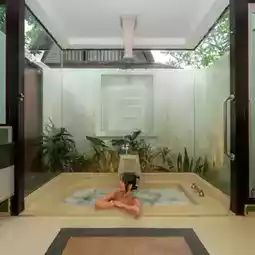 This small, lovely resort offers stunning rooms. We stayed in a beautiful Beachfront Villa, a beachfront villa. From the villa, it's just a few steps to the ocean, or you can simply relax and enjoy the sea views from the balcony. The villa is spacious, and the bathroom is superb, with a bathtub and a view. The room is fully equipped with all the amenities.