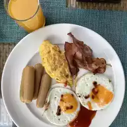 🍳 The breakfast line is so much that you can't finish it. The breakfast area is next to the beach and the swimming pool.