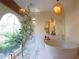 The room is also beautifully decorated. Every detail is taken care of. It has complete amenities, a bathtub, and Netflix. It is perfect for those who want to relax. The accommodation area is shady with green trees, giving a relaxing feeling. There are also many activities to do, such as kayaking, paddleboarding, and a communal swimming pool.