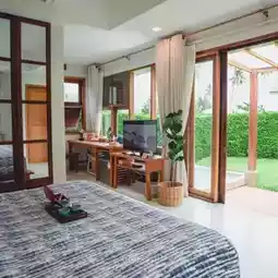 The accommodation is a boutique pool villa. It is spacious and private. There is a chill-out area in front with a bathtub. It is so cool.