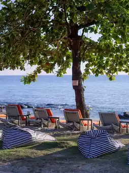 Plenty of photo spots, from net hammocks by the sea to wooden chairs under coconut trees