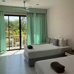 A resort with a good atmosphere and a beautiful beach. For those who like a quiet atmosphere in the evening, I recommend this place. The accommodation in the resort is decorated in various colors. The rooms are large and look newly renovated. The soap and shampoo smell very good. The smell of rice milk. The breakfast is delicious. The resort is shady and has a beautiful garden. The beach is a little far from the room. Walk about 100 meters and you can play in the sea.