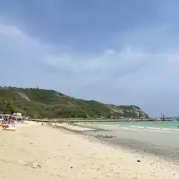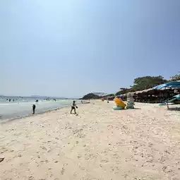 Haad Samae, a beautiful beach on Koh Larn. This beach has a great atmosphere, is quiet, has places to sit and relax, has delicious restaurants, and has surfboards for rent. On this beach you can see solar panels that are used to produce electricity for use on the island. There is only one resort here, so the beach looks quiet and peaceful, but the sea water is clear and beautiful, with good wind. You can sit here for a while and fall asleep right away. If you come to Koh Larn, you can't miss it. #Sea near Bangkok #Beautiful islands in Thailand #Pattaya attractions