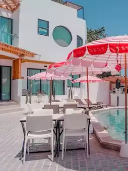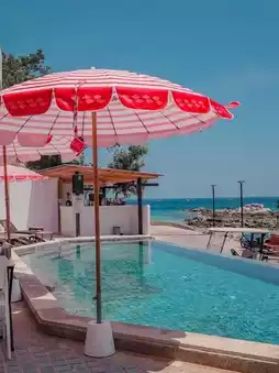 The accommodation can see a 360-degree sea view from the window. In front of the accommodation, there is a not-so-large pool. And there are red and white umbrellas. Which contrasts with the sky. It's very beautiful. There is a food and beverage service that is open from 10 am to 9 pm. Eat all day long.