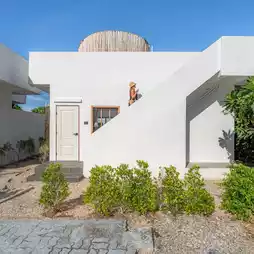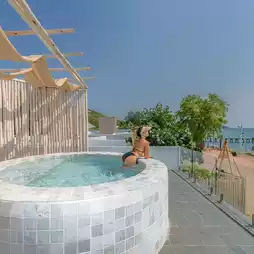 Blue Villa, a perfectly sized villa with a rooftop terrace and a unique, chic, circular Jacuzzi for relaxing and enjoying the beautiful sea views. The interior is decorated in a minimalist style, facing the sea.