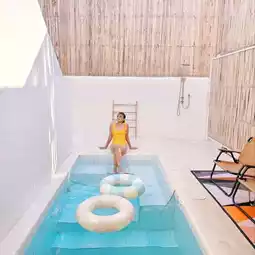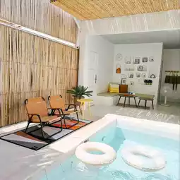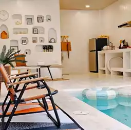 The accommodation has two floors, in a comfortable white tone, decorated with wood on the lower wall, looking cool. There is a seating area by the pool for us to take beautiful pictures. Inside the accommodation, there is a swimming pool with a float in the middle of the house.