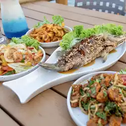- For dinner, you can buy grilled seafood to eat or order dinner from the accommodation. The seaside corner here is beautiful, peaceful, and truly a beachfront accommodation. We really like it.