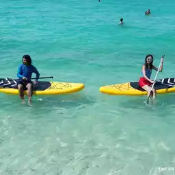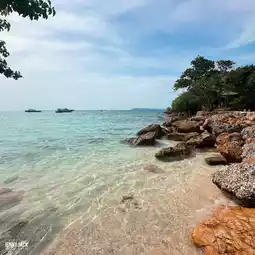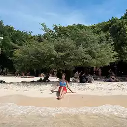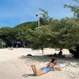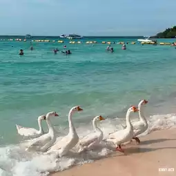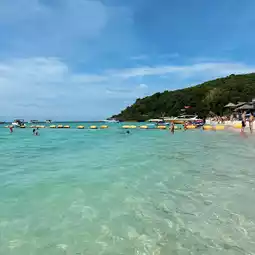 🏝️ When you visit Koh Larn, don't miss Thian Beach, a white sandy beach with trees in front of the beach and big candle trees. The sea is very clear. There are many tourists playing in the water and sunbathing.
