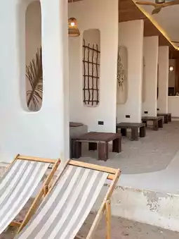 Kamari Cafe & Resort Kohlarn is a lovely place to visit, with the resort and cafe areas clearly separated. We entered the cafe area, which offers a wide selection of drinks, all of which are adorable. This is a must-try for content lovers. Besides drinks, they also have a wide variety of cakes, ice cream, and other delicious food. The interior is decorated to create a beach-like atmosphere. ✨💫☘️