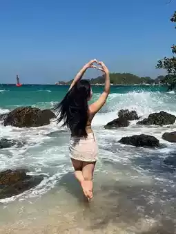 Today, I'm sharing a secret photo spot on Ta Yai Beach on Koh Larn. It's a unique spot that's incredibly chic for photos. If you're planning a trip to Koh Larn, give it a try! The view is stunning, and there are even puppies nearby. If you're visiting, please share some treats with the little ones! 🫶🏻🔆🤍