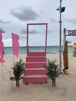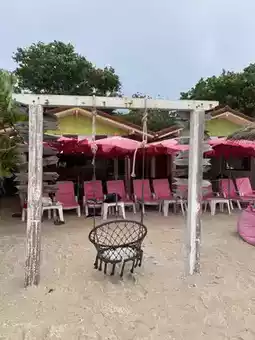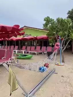 When I came to Samae Beach, I couldn't resist sitting and enjoying the sea view. But I ended up finding the cutest place to sit! The entire restaurant is pink! It's so adorable! This place is right next to the stingray project. Walk all the way to the end of Samae Beach and you'll be drawn to the shop, as it's completely pink. We went and they had a special offer: if you order one dish per person, you can sit on the bed without paying the extra fee. If you don't order, you have to pay 100 baht per person. Personally, I think ordering food to go with the meal is a better deal. It's only a few baht more and you get to eat something extra. It's a great deal! 🫶🏻🌷💗🔆🌊