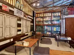 🛟 The restaurant's retro decor features vintage brand logos on the walls and dark brown wooden tables, reminiscing about the past.