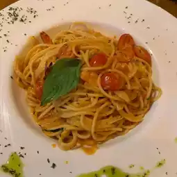The box pasta is spaghetti, tomato sauce, dried chili, shrimp, cherry tomato, very delicious. This dish