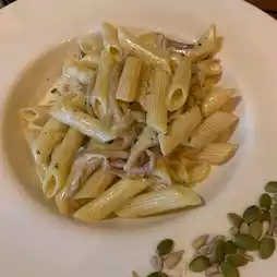penne stir-fried in cream sauce, mushrooms, and sunflower seeds, crunchy and goes well together, very delicious.