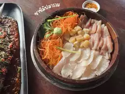 Everyone, we would like to recommend this restaurant. It's very delicious. It's seafood. We want you to come and try it. The restaurant is located on Koh Mak. The restaurant is called Baan Muang Siu. The menu on the table that we ordered had Pla Hiw with chili sauce, Spicy crab salad, Stingray curry, Thai fish sashimi, and mussel sashimi. Everything was good. The sauce was also good. Anyone who tries this flavor should be addicted like us. If you have a chance to visit Koh Mak, we really want you to try it.