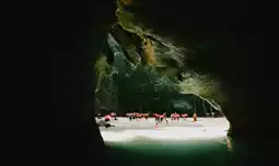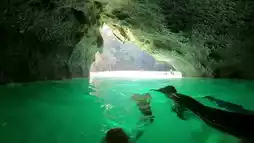 At the entrance of the cave, sunlight reflects off the water, rendering it an emerald green. On the other side is a large cavern. Inside, there's a pristine white sand beach surrounded by steep, illuminated cliffs.