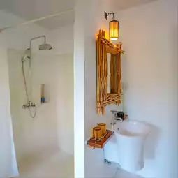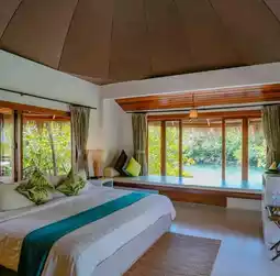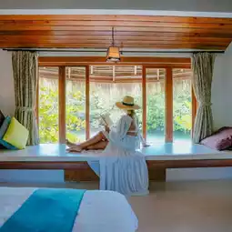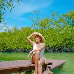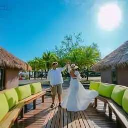I had to stay at Villa R7. It had a great angle, great view, and was very private. It's really perfect for relaxing. The room is decorated in a Balinese style. There's a balcony almost around the room. There's a pier where you can walk down to the water from the room. And the glass doors open to give you a satisfying view. If you're hungry, you can eat at the restaurant here. Actually, even if you're not a customer of the resort, you can stop by to eat and take pictures on the beach. They have set up a pavilion, props, hammocks, and beautiful photo spots. Then let's go see the atmosphere.