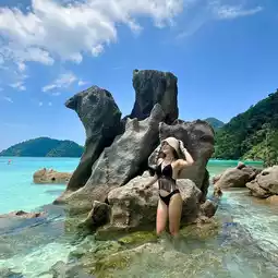 ⛰️🏝️ Another beautiful photo spot when visiting the Surin Islands is to take a photo with the Hen Rock at Ao Chong Khad. There is a channel between the North and South Surin Islands. The water is very clear and beautiful. There is white sand and many tourists.