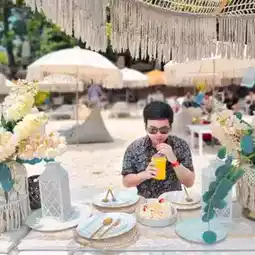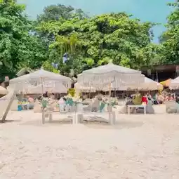 There are cushions on the beach with tables and umbrellas, and seats in the shop for those who don't like the hot sun. Foreigners prefer to sit on the beach cushions.