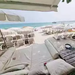 🏖 This white cafe is located inside a resort, right on the beach at Sai Kaew Beach. It offers stunning sea views, azure waters, and fine white sand. There are many photo opportunities and plenty of props. There's seating inside the bar area and outside on the beach with cushions. It can be a bit hot, but there are umbrellas available.