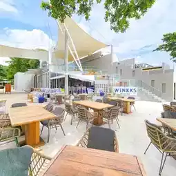 In the evening, come down for dinner at Winkks Beach Club, a new Bali-style beach club. It's a restaurant and cafe. The food here has a wide variety of menus, both Thai and international. And a wide selection of drinks, delicious taste, big plates, and every Friday-Saturday night, there is live music and an exciting fire twirling show to watch.