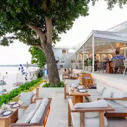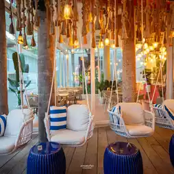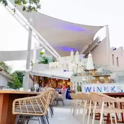 Winkks Beach Club, a beach club on Koh Samet that anyone who comes to Koh Samet must stop by. This place is located on Sai Kaew Beach. It is a beach with soft white sand and bright blue sea, which blends in with the shop's decorations, which are mainly blue and white. There are plenty of photo spots and places to relax.