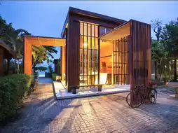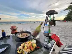 The room has a large, soft bed. The bathroom is spacious. There is a full range of amenities such as a TV, refrigerator, and hair dryer. There is a buffet breakfast in the restaurant area. In the evening, the hotel's beachfront area is open as a bar. There is music and beanbag seats for customers to sit and watch the sunset.