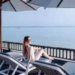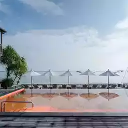 🛟The highlight here is the striking orange swimming pool with a sea view. You can swim and take beautiful pictures🏖️ You can also walk down to the beach and play in the sea because this place is right by the sea. The atmosphere is very good and there are not many people. We love this place sooooo much ⛱️
