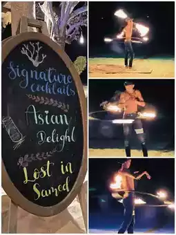 There is a beautiful drinking area with good lighting for taking pictures or enjoying the atmosphere. The beach is a relaxing place to eat with a fire show from the restaurant. There are also waiters who provide warm and friendly service, recommend menus, and take care of us politely.