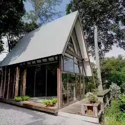 is a lovely cafe shaped like a beautiful wooden A-frame house.