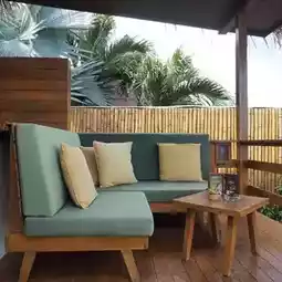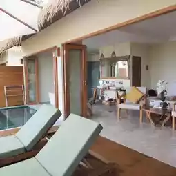 The balcony is wide, for sitting and relaxing, there is a sunbed, a private swimming pool