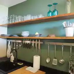 Dishes, bowls, pans, oven, SMEG refrigerator, wine glasses, knives, everything