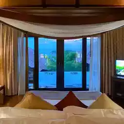 The rooms are built along the hillside, which is quite steep. If you walk, you will get tired. Therefore, the resort provides a buggy shuttle service. The accommodation is a villa with a private swimming pool. Inside the room, there is a bed in the middle of the room. Behind it, there is a wardrobe, a dressing table, and a daybed in another corner.